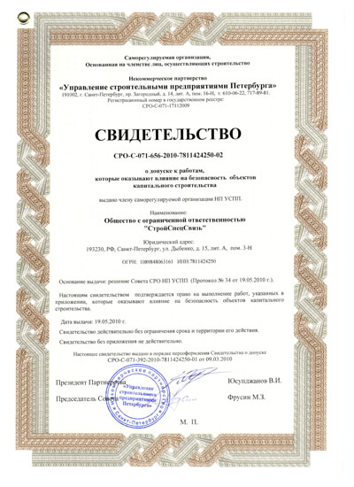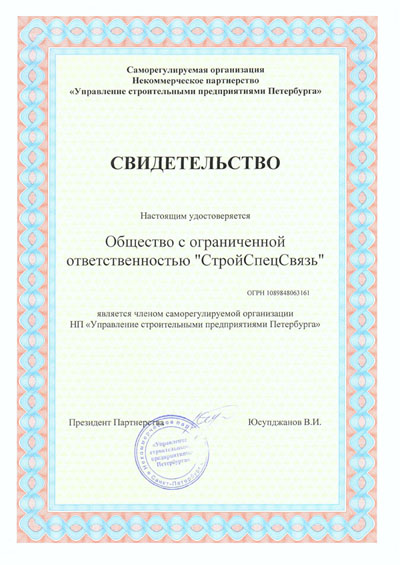Компания "СтройСпецСвязь" является действительным членом саморегулируемой оранизации НП "Управление строительными предприятиями Петербурга"